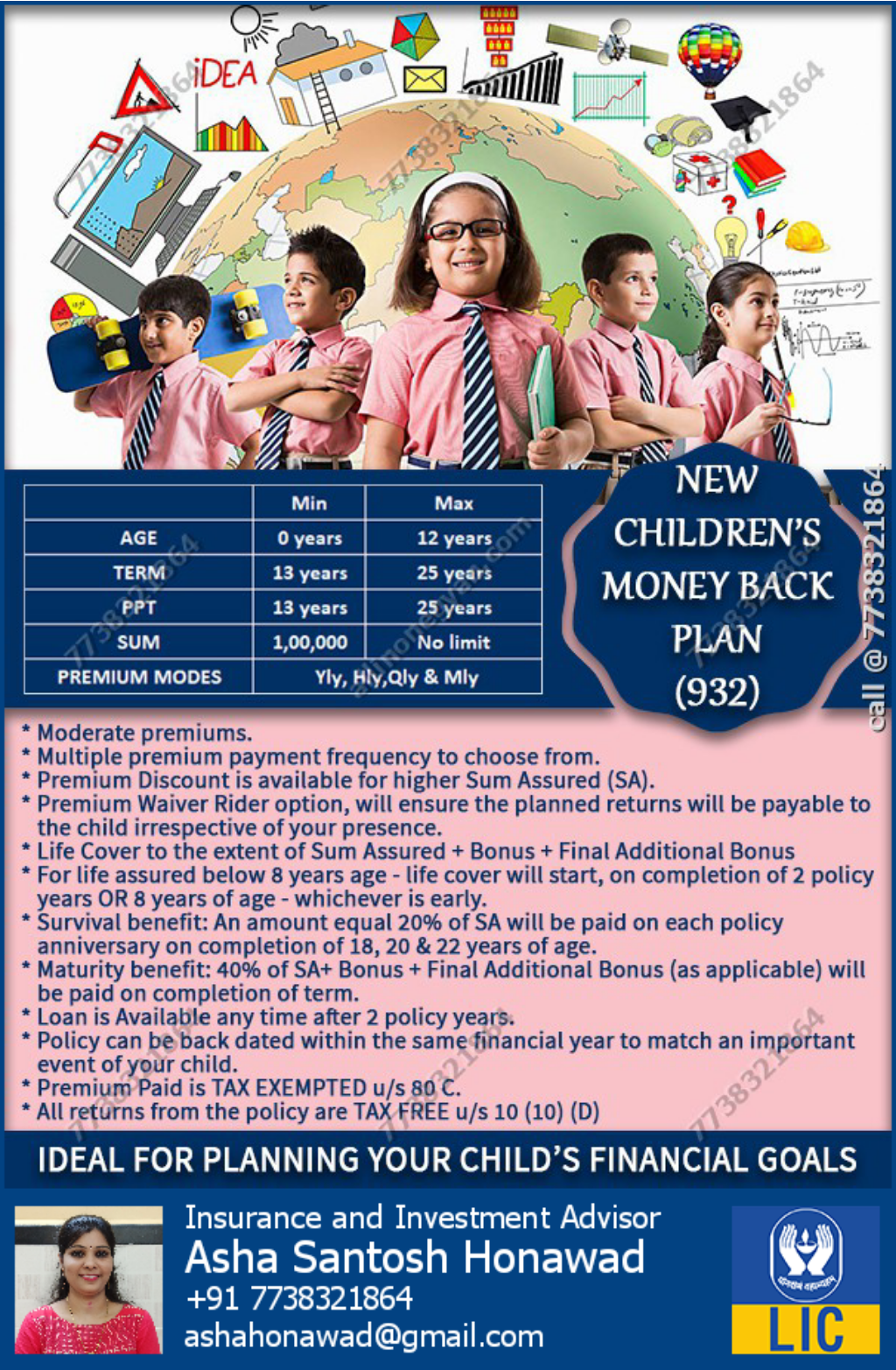 LIC's New Children's Money Back plan has been designed to meet the educational & other needs of the child